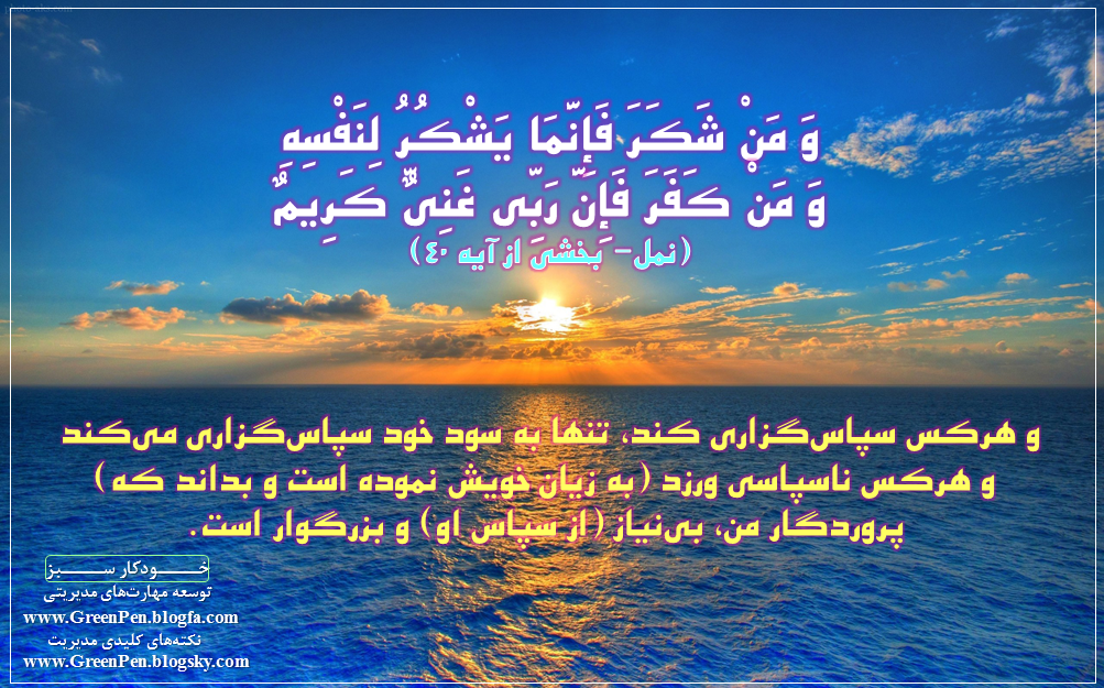 وَمَنْ شَکَرَ فَإِنَّمَا یَشْکُرُ لِنَفْسِهِ وَمَنْ کَفَرَ فَإِنَّ رَبِّی غَنِیٌّ کَرِیمٌ