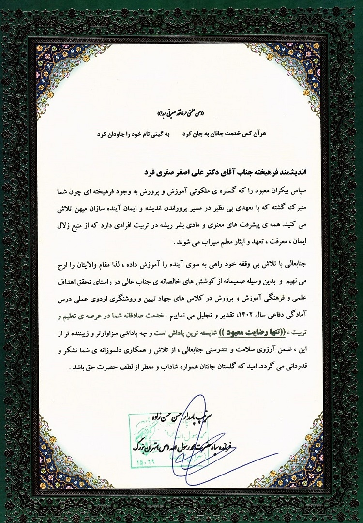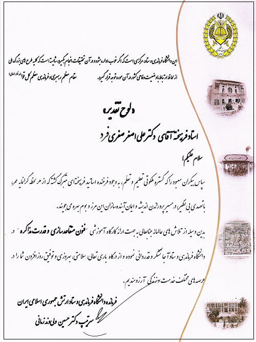 تقدیرنامه اعطایی از سوی سردار سرتیپ پاسدار حسن حسن زاده