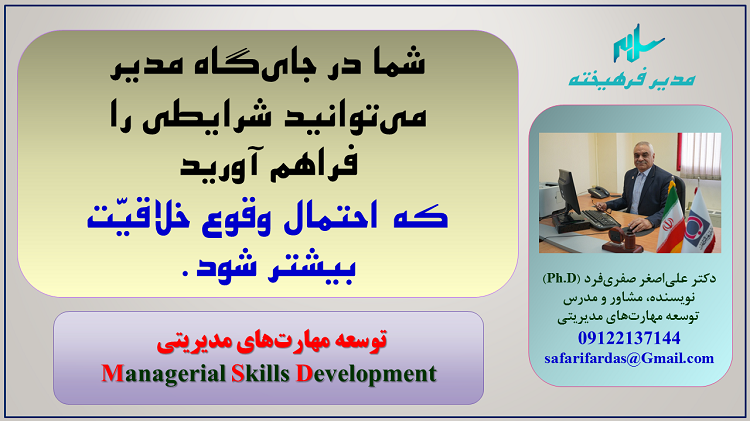 1) یکی از عمدهترین دغدغههای مدیران کارآمد در سطوح مختلف، چگونگی ایجاد بسترهای مناسب برای عوامل انسانی شاغل در تمام حرفهها است تا آنها با حس مسئولیت و تعهد کامل به مسائل در جامعه و حرفه خود به کار بپردازند و اصول اخلاقی حاکم بر شغل و حرفه خود را رعایت کنند.